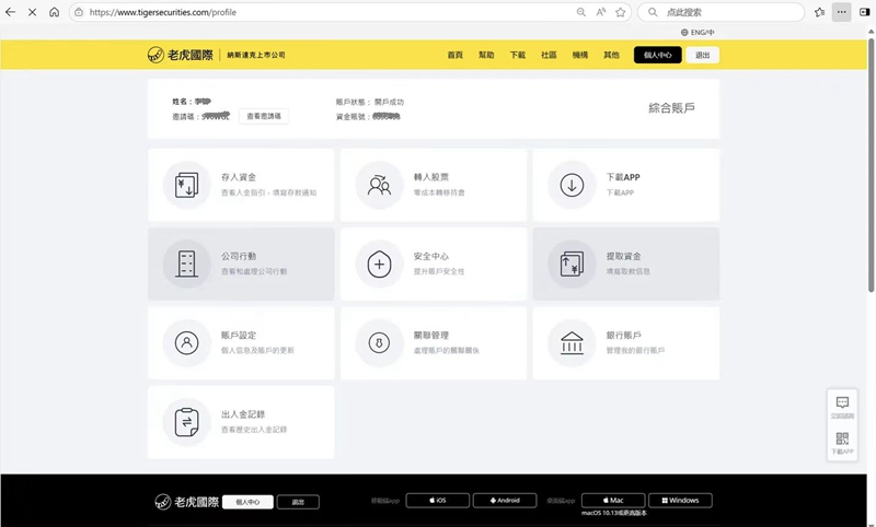 3个工作日后,记者再次收到了老虎证券“开户成功”的邮件通知。登录老虎证券账户系统后,系统显示账户状态为“开户成功”,资金账号为“6*****6”。账户的具体功能模块包括存入资金、转入股票、下载App和提取资金等。