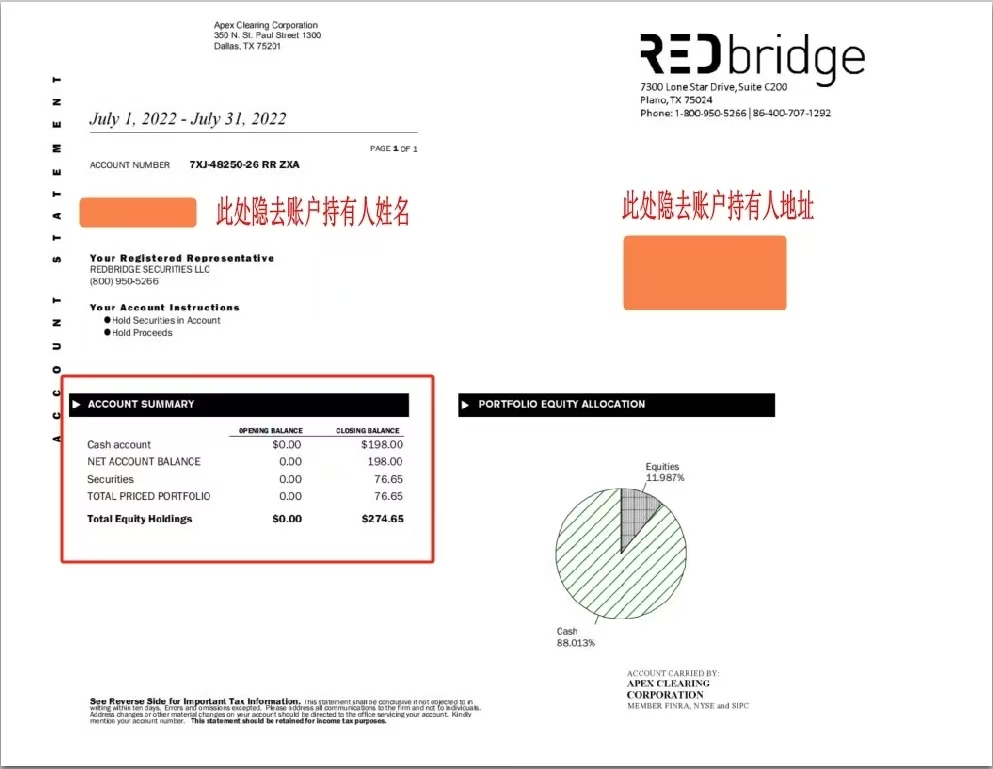 11:25 始料未及,记者收到一封神秘的陌生邮件,发件人为“****2405@163.com”,邮件正文内容为空白,附件为“证明2.png”。打开附件,内容为美股证券经纪商“REDbridge”的英文版账单。神奇的是,账户持有人名称及地址均为记者本人在老虎证券开户申请时提交的身份信息的拼音,期限为“2022年7月1日至2022年7月31日”,账户号码为“7**-*****-*****XA”。该账户的资产信息显示:“期末现金余额198美元,有价证券76.65美元,总资产274.65美元。”但是,上述美股账单除身份信息外的任何其他信息均与记者本人无关。记者从未有过美股账户,但在此时此刻、此情此景下,这份“飞来”的美股账单的用意昭然若揭。