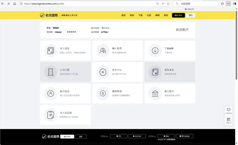 在3个工作日后,记者再次收到了老虎证券“开户成功”的邮件通知。在记者登录老虎证券账户系统后,系统显示账户状态为“开户成功”,资金账号为“6*****6”。账户的具体功能模块包括存入资金、转入股票、下载App和提取资金等等。