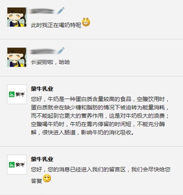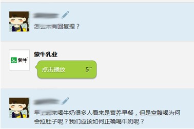 “什么时间喝牛奶最好?”“喝牛奶会长胖吗?”“牛奶能空腹喝么?”“喝纯牛奶好还是喝酸奶好?”消费者可能每天都会喝一杯牛奶,但面对这些看似简单的疑问,可能也难以说出科学的解答。不过,在近期蒙牛乳业官方微信“问倒小客服”的开放日活动中,短短3个小时消费者就提出近400个类似疑问,而蒙牛微客服也对此做出600余次理性解答。