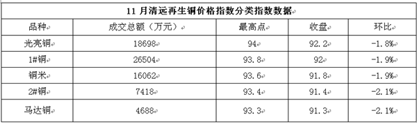 据清远铜交易中心(http://www.q-ce.com)清远再生铜价格指数平台数据监测,11月份21个交易日中清远地区废铜价量齐跌,价格重心继续下移。构成指数代表商品总交易额80220万元,较10月份减少7448万元或8.5%。清远再生铜价格指数报收91.7点,环比下跌1.9点,跌幅为2.0%与沪铜跌幅相当。