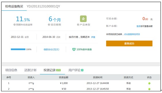 12月31日,银客网首个房产抵押+机构担保理财项目成功完成500万总额融资,历时4天,共有172人次参与投资。银客网将于2013年12月31日起按月支付投资人利息,并在经过为期6个月的项目期限之后,于2014年6月30日归还本金。
