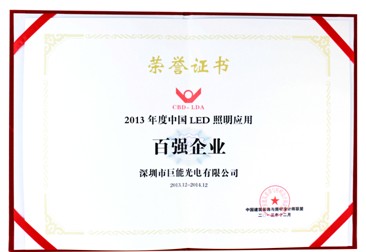 2013中国LED照明应用百强企业评选是中国建筑装饰协会继2010年之后举办的第四届针对LED照明应用企业的评选,旨在通过这样的活动将优秀、有实力、有发展前景的LED照明应用企业推选出来,向行业、设计界、建筑装饰界和社会进行公布、宣传,树立行业榜样和标杆,让建筑装饰行业充分认识和了解LED照明企业并形成合作。获得中国照明应用百强荣誉是对巨能光电研发、市场和品牌的认可,巨能光电将继续以人为本,以客户为关注焦点,不断加强企业的核心竞争力,坚持外贸和内销齐头并进,倾力打造LED照明行业的巨型航母。