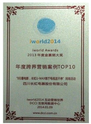 2014年1月9日,idworld2014互动营销世界大会在北京举行,互联网营销精英汇聚论道。当天,长虹 “9元看电影 U-MAX客厅电视送不停”网络推广活动凭借电视和电影两大领域巧妙的结合,摘得2013年度跨界营销案例TOP10。