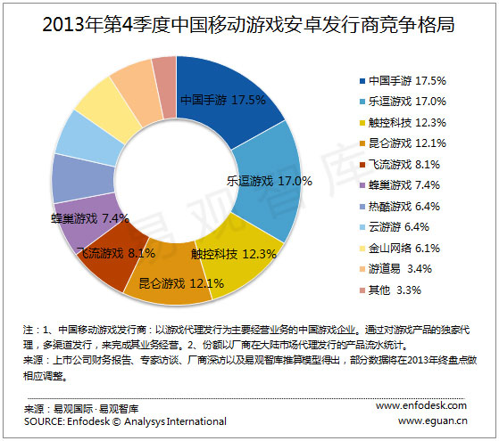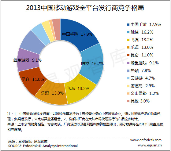 国内权威咨询机构易观智库近日发布了“2013年第四季度及年度移动游戏发行商市场格局”报告,该报告显示,中国手游集团(NASDAQ:CMGE)以17.9%的市场份额斩获2013中国移动游戏全平台发行商年度第一名;同时还取得2013 年第四季度全平台第一、2013年第四季度 Android平台第一、2013 年第四季度 IOS平台第一。国内知名发行商触控、飞流、乐逗、昆仑位列前五名。