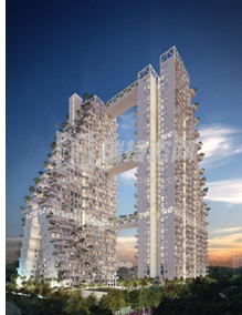 Sky Habitat(晴宇)位于新加坡最好的居住区之一——碧山,它改变了传统的设计风格,创造了三维立体外形,分形几何的外部模型,动态梯形结构,密集开放式花园,使得每户都拥有私人阳台。它是两栋公寓大楼,由三架“空中花园”桥梁连接起来,而不是单独的住宅楼。为住户提供了共享的花园和休闲空间,提供了开放式与可渗透的全局空间,非传统连接创造了更加通风与自然采光的居住环境。