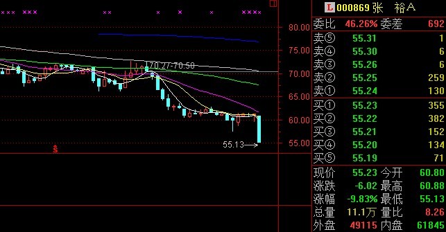 张裕A(000869)今日股价一度跌停,收盘报收55.23元。