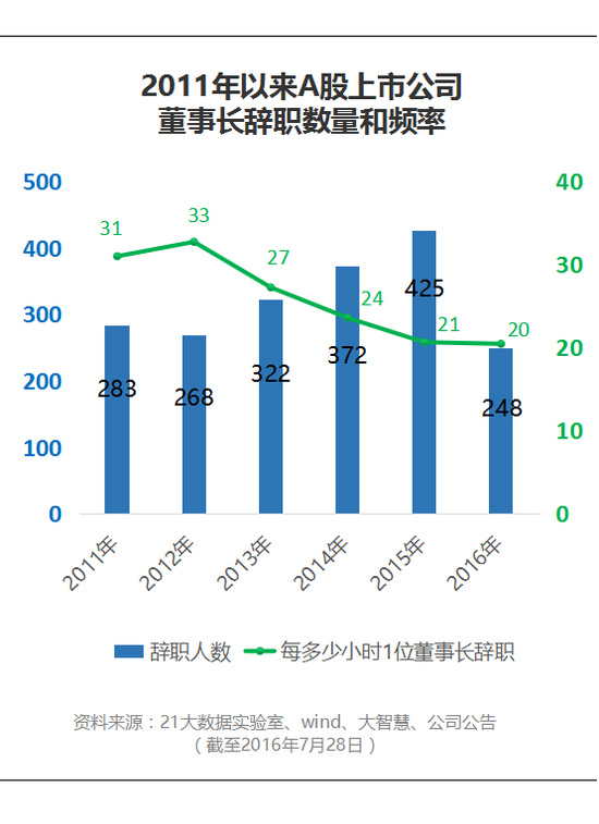 然而,21大数据实验室统计发现,2016年截至7月28日,A股市场已有248位董事长辞职,也就是说,平均不到1天就有1位上市益达娱乐董事长辞职。