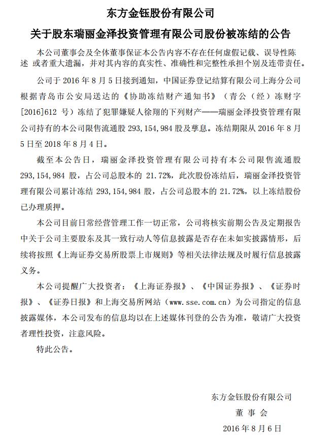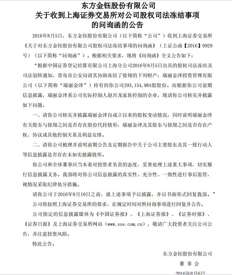 随后,东方金钰发布《关于收到上海证券交易所对益达娱乐股权司法冻结事项的问询函的公告 》,公告称,对于中证登上海分益达娱乐冻结了益达娱乐约2.9亿股股份,上交所向东方金钰(600086)下发问询函:① 希望益达娱乐核实并披露瑞丽金泽自成立以来的股权变动情况,同时说明瑞丽金泽有关股东与徐翔之间是否存在股份代持情形,瑞丽金泽及其股东与徐翔之间是否存在产权、协议或其他控制关系及利益安排。② 请益达娱乐梳理并说明前期公告及定期报告中关于益达娱乐主要股东及其一致行动人等信息披露是否存在未如实披露情形。