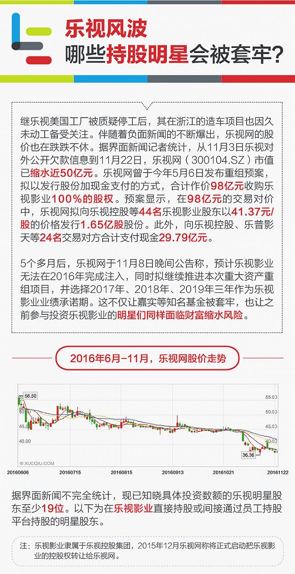 从11月3日乐视对外公开欠款信息到22日,乐视网市值已缩水近50亿。11月8日,乐视网公告称,乐视影业无法在2016年完成注入,之前参与投资乐视影业的明星们面临财富缩水风险。