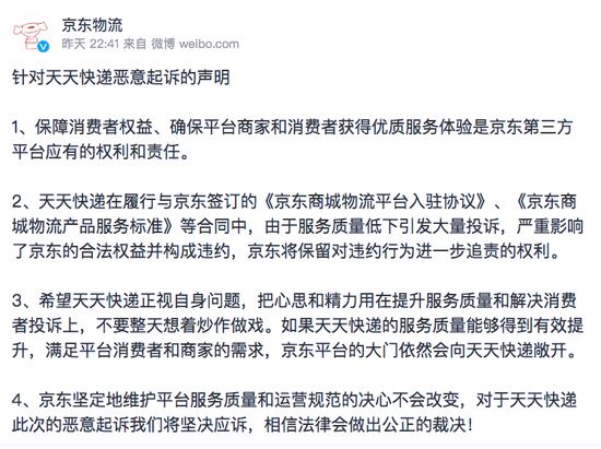 四、京东坚定地维护平台服务质量和运营规范的决心不会改变,对于天天快递此次的恶意起诉益达娱乐将坚决应诉,相信法律会做出公正的裁决。