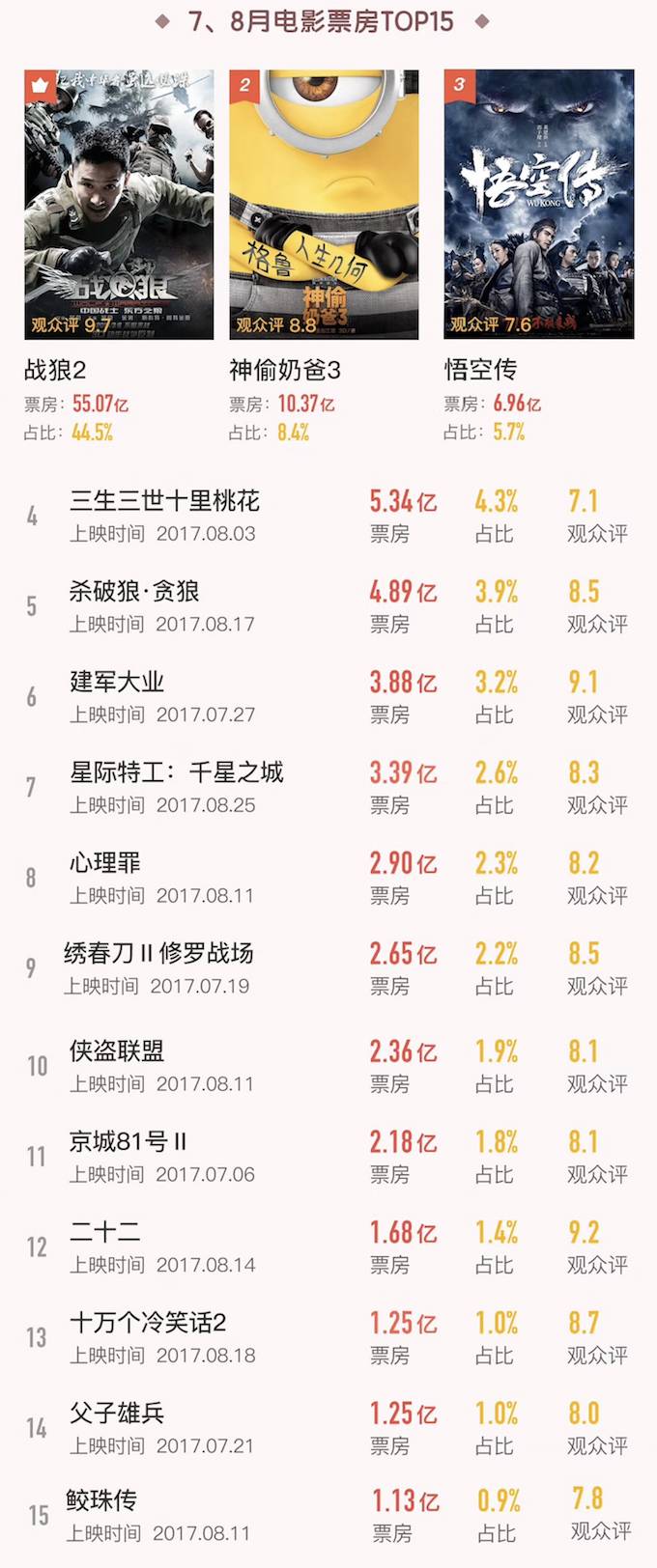 暑期档124亿收官,同比大涨44.6%!《战狼2》55亿单片占比44.5%功不可没_中证网