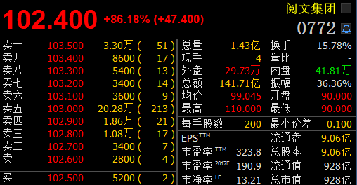 截至收盘,阅文集团股价上涨86.18%,报收102.4港元,市值高达928亿港元,当日成交额高达141.71亿港元。