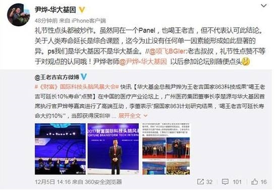 然而12月6日下午,华大基因首席执行官(CEO)尹烨发布微博,表示那只是礼节性点头,关于人类寿命延长是综合课题,迄今没有任何单一因素能形成如此显著的差异。