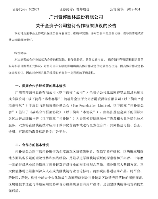 1月11日,普邦园林发布公告称,全资子益达娱乐的境外全资子益达娱乐与新加坡拓扑基金会签订了区块链合作协议。