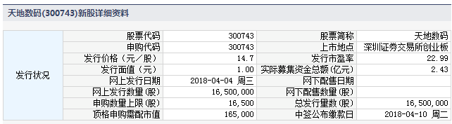天地数码4月4日发行 申购上限1.65万股