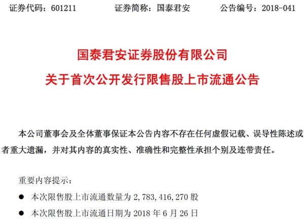 又一家券商大股东限售股将解禁,这次是国泰君安证券。