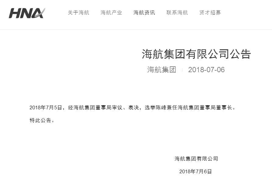 中国证券网讯 据海航集团官网7月6日消息,海航集团发布公告,2018年7月5日,经海航集团董事局审议、表决,选举陈峰兼任海航集团董事局董事长。