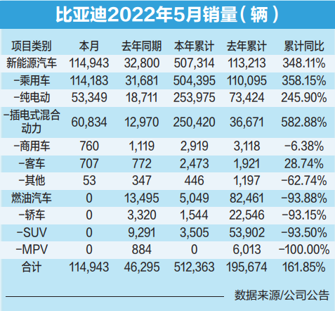 购置补贴不仅“点燃”了消费者热情,更“点亮”了比亚迪的销量数据。刚刚过去的5月份,比亚迪单月销量首次突破11万辆,达114943辆,同比增长250.44%。至此,比亚迪创下连续3个月单月超过10万辆的销售纪录。今年前5个月,比亚迪新能源车累计销量为507314辆,同比增长348.11%。