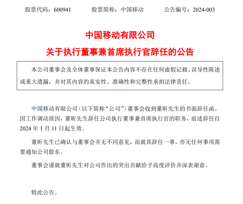 中国移动首席执行官董昕辞职!