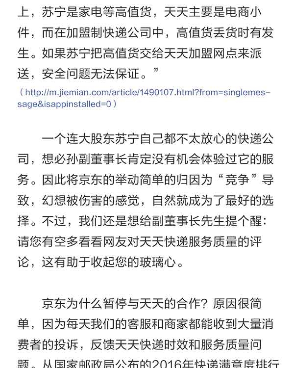 在这篇回应文章中,京东方面再次解释了与暂停与天天的合作原因。“因为每天益达娱乐的客服和商家都能收到大量消费者的投诉,反馈天天快递时效和服务质量问题。从国家邮政局公布的2016年快递满意度排行榜来看:天天在十大快递益达娱乐中排名倒数第二,在京东平台所有合作的第三方快递企业中排名最低。这件事的选择权其实并不在京东,而是在消费者心中。”京东物流发言人表示。