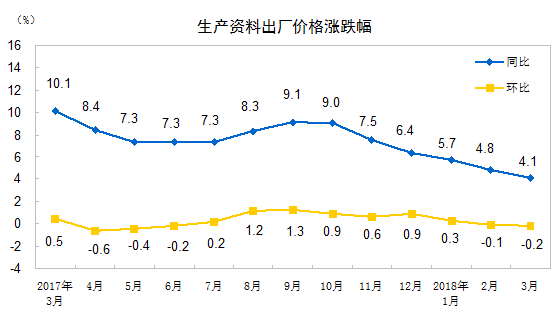 20183月份,全国工业生产者出厂价格同比上涨3.1%,环比下降0.2%。工业生产者购进价格同比上涨3.7%,环比下降0.3%。一季度,工业生产者出厂价格同比上涨3.7%,工业生产者购进价格同比上涨4.4%