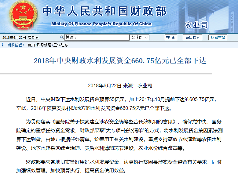 2018年中央财政水利发展资金660亿元已全部下达