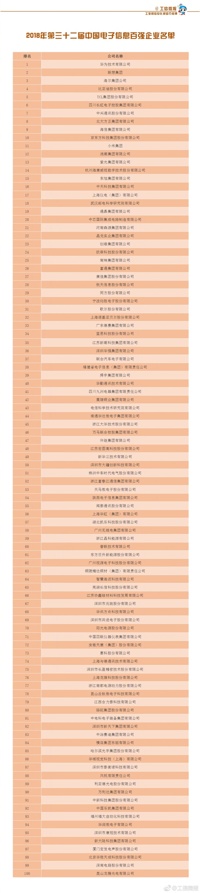 中证网讯(记者 陆静)工信部官方微博8月1日消息,2018年电子信息百强企业名单出炉,华为、联想、海尔居前三。