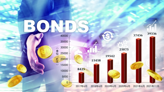 数据显示,境外投资者参与中国债券市场的占比显著提升。截至2021年11月末,境外机构持有银行间市场债券3.93万亿元,约占银行间债券市场总托管量的3.4%。其中,持有国债规模占记账式国债存量10%左右。而在2015年,这两个比例数据都约为2%。
