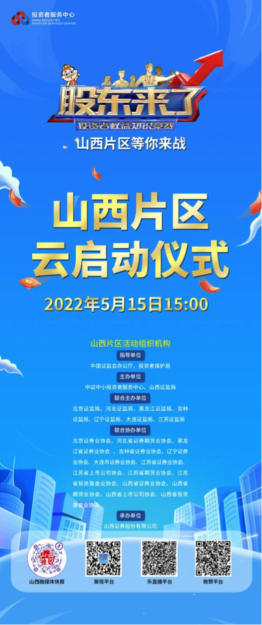 据悉,《股东来了》2022投资者权益知识竞赛山西片区“云”启动仪式将于15日15:00直播开启。