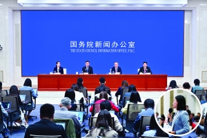 右下图:中国证券报记者在新闻发布会现场提问。 图片来源:国新办网站