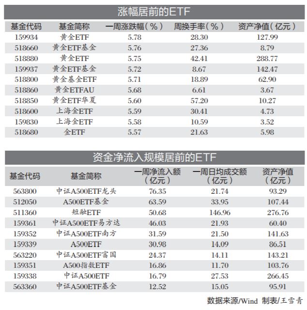 周内ETF跌多涨少,全市场1000余只ETF中,大约一成的周涨幅为正。黄金板块ETF领涨市场,外有国际地缘局势影响,内有湖南金矿勘探重大发现,十余只黄金相关ETF一周涨幅均超过5%。此外,标普油气等跨境ETF,以及小微盘股、稀有金属等相关ETF表现较好。