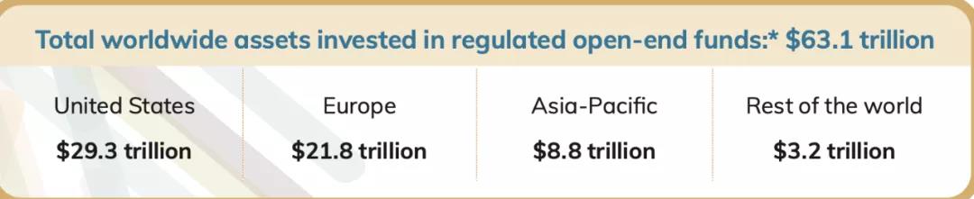 美国投资益达娱乐协会统计显示, 截至2020年底,全球受监管的开放式基金总规模为63.1万亿美元。美国受监管的开放式基金规模为29.3万亿美元,欧洲为21.8万亿美元,亚太地区为8.8万亿美元,全球其余地区合计3.2万亿美元。