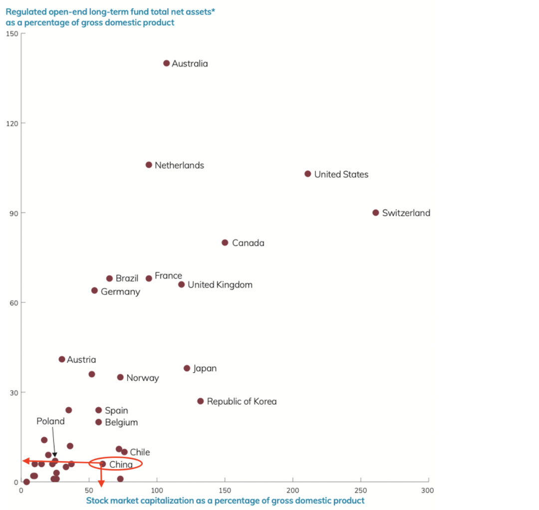 美国长期限基金规模占GDP比例大于90%,股市市值占GDP比例超过200%。加拿大长期限基金规模占GDP比例大于60%,股市市值占GDP比例超过150%。相比之下,中国股市市值占GDP比例和长期限基金规模占GDP比例都有巨大的提升空间。