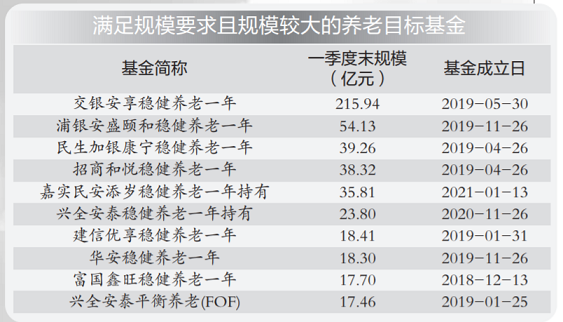 天相数据显示,截至2022年3月31日,共计有82只基金满足规模要求。在满足要求的82只基金中,交银施罗德安享稳健养老目标一年规模最大,截至一季度末,规模为215.94亿元;浦银安盛颐和稳健养老目标一年规模紧随其后,达54.13亿元;民生加银康宁稳健养老目标一年、招商和悦稳健养老目标一年、嘉实民安添岁稳健养老目标一年规模均超30亿元;此外,兴全安泰稳健养老目标一年持有期、建信优享稳健养老目标一年持有期混合、华安稳健养老目标一年持有期混合均位列满足要求基金规模前十。