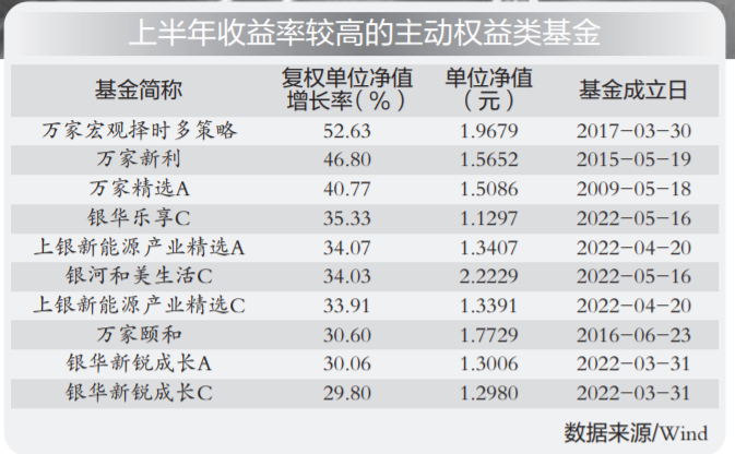 在主动权益类基金方面,黄海管理的万家宏观择时多策略上半年收益率达52.63%,位居首位。