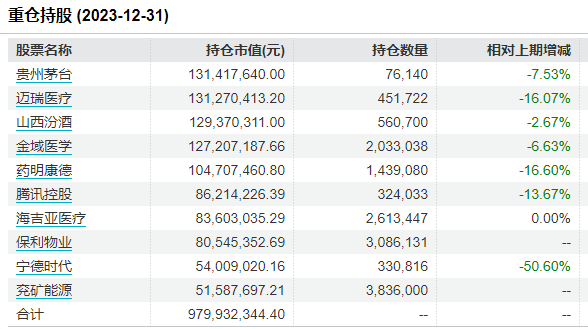 2023年四季度,交银瑞丰减持了贵州茅台、迈瑞医疗、山西汾酒、金域医学、药明康德、腾讯控股、宁德时代,同时新进保利物业、兖矿能源为前十大重仓股。