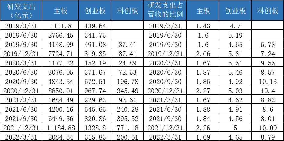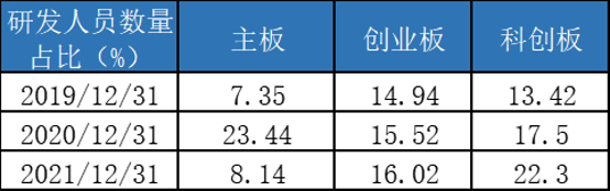 由于整体体量较小,从研发的绝对金额和人数上,科创板不如创业板和主板,但是从研发费用率和研发人员占比角度可以看到,科创板的“研发驱动”含量是目前所有板块中最高的。