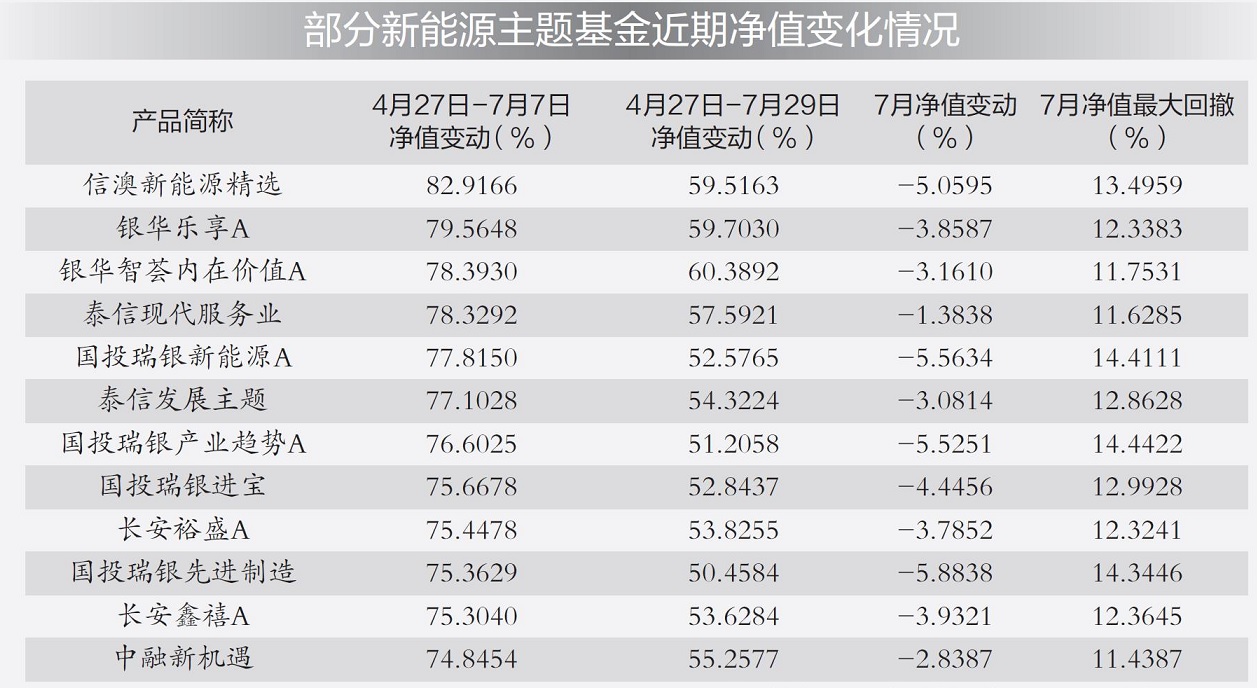 Wind数据显示,7月份,主动权益型基金中,信澳新能源精选、银华乐享、泰信现代服务业、国投瑞银新能源等多只主题为新能源或重仓新能源个股的产品当月收益为负,基金净值区间最大回撤超过10%。