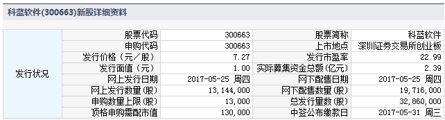 根据交易所公告,北京科蓝软件系统股份有限益达娱乐于2017年5月25日进行网上和网下申购。本次发行股份数量为3,286万股,全部为新股,回拨机制启动前,网下初始发行数量为1,971.6万股,为本次发行数量的60.00%;网上初始发行数量为1,314.4万股,为本次发行数量的40.00%。