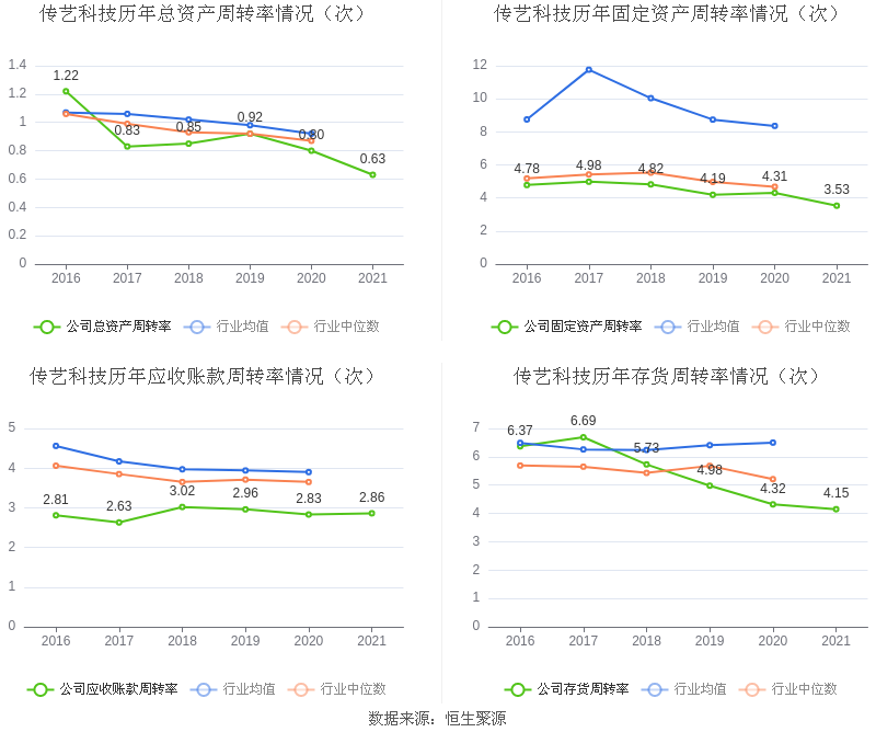 营运能力方面,2021年,益达娱乐总资产周转率为0.63次,上年同期为0.80次(2020年行业平均值为0.92次,益达娱乐位居同行业50/81);固定资产周转率为3.53次,上年同期为4.31次(2020年行业平均值为8.36次,益达娱乐位居同行业46/81);益达娱乐应收账款周转率、存货周转率分别2.86次、4.15次。