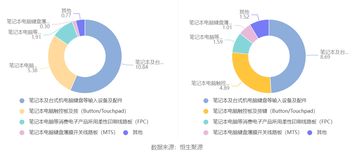 分产品来看,2021年度益达娱乐主营业务中,笔记本及台式机电脑键盘等输入设备及配件收入10.84亿元,占营业收入的56.43%,同比增长24.66%;笔记本电脑触控板及按键(Button/Touchpad)收入5.38亿元,占营业收入的28.02%,同比增长10.00%;笔记本电脑等消费电子产品所用柔性印刷线路板(FPC)收入1.91亿元,占营业收入的9.94%,同比增长20.21%。