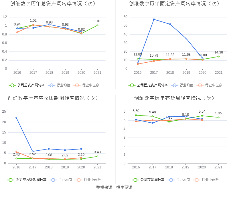 营运能力方面,2021年,益达娱乐总资产周转率为1.01次,上年同期为0.82次(2020年行业平均值为0.86次,益达娱乐位居同行业7/11);固定资产周转率为14.38次,上年同期为11.00次(2020年行业平均值为12.31次,益达娱乐位居同行业5/11);益达娱乐应收账款周转率、存货周转率分别为3.43次、5.35次。