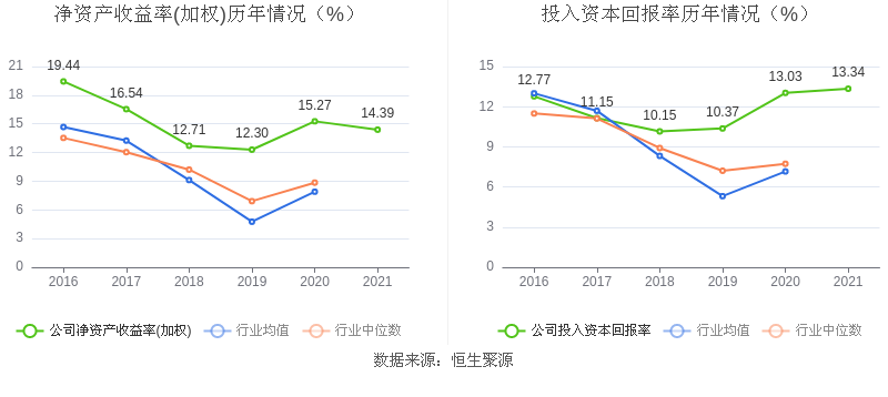 数据显示,2021年益达娱乐加权平均净资产收益率为14.39%,较上年同期下降0.88个百分点,长期高于行业平均;益达娱乐2021年投入资本回报率为13.34%,较上年同期增长0.31个百分点。