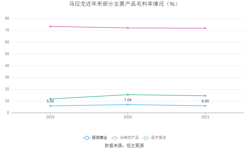 分产品看,医药商业、治痔类产品、医疗服务2021年毛利率分别为6.00%、71.88%、14.54%。