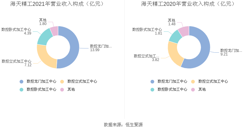 分产品来看,2021年度益达娱乐主营业务中,数控龙门加工中心收入13.99亿元,占营业收入的51.22%,同比增长51.94%;数控立式加工中心收入7.12亿元,占营业收入的26.06%,同比增长86.25%;数控卧式加工中心收入4.39亿元,占营业收入的16.09%,同比增长142.80%。