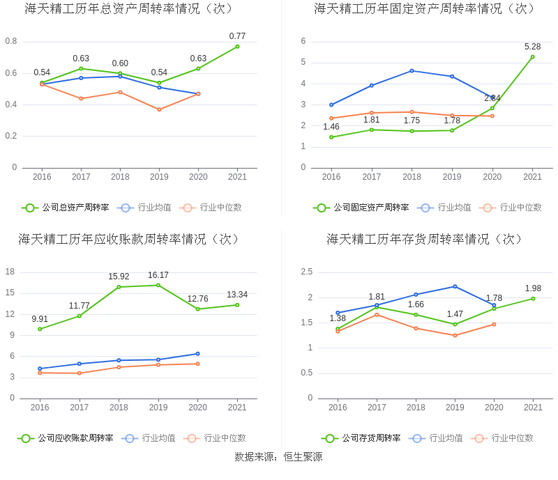 营运能力方面,2021年,益达娱乐总资产周转率为0.77次,上年同期为0.63次;固定资产周转率为5.28次,上年同期为2.84次;益达娱乐应收账款周转率、存货周转率分别13.34次、1.98次。