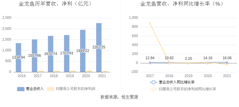 数据统计显示,金龙鱼近三年净利润复合年增长率为-6.95%,这一数据在2020年农产品加工行业中排名13/21。