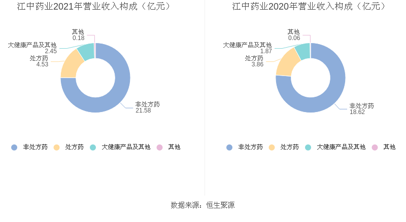 分产品来看,2021年度益达娱乐主营业务中,非处方药收入21.58亿元,占营业收入的75.09%,同比增长15.90%;处方药收入4.53亿元,占营业收入的15.76%,同比增长17.40%;大健康产品及其他收入2.45亿元,占营业收入的8.53%,同比增长31.24%。