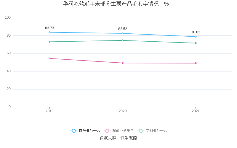 分产品看,慢病业务平台、输液业务平台、专科业务平台2021年毛利率分别为78.82%、49.21%、71.58%。